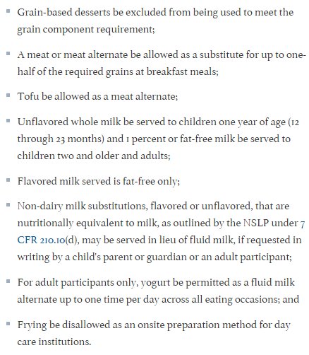 New rules for federal meals programs: There's no frying in daycare. #HowGovtWorks https://www.federalregister.gov/articles/2015/01/15/2015-00446/child-and-adult-care-food-program-meal-pattern-revisions-related-to-the-healthy-hunger-free-kids-act …pic.twitter.com/b7YT0j5YuY