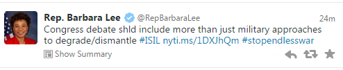@RepBarbaraLee and @RepMikeHonda offer alternative to AUMF, focusing on "regionally-led" strategy to degrade ISISpic.twitter.com/xvPAhGzBxR
