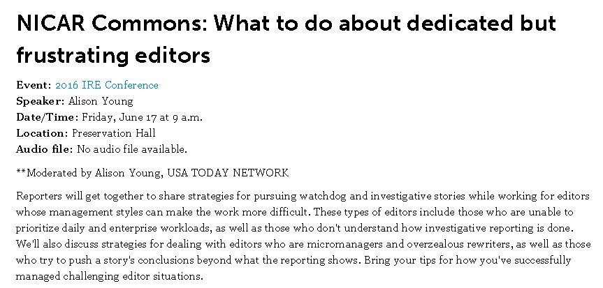 Is your editor a ... challenge? Join me in sharing tips at this #IRE16 group discussion for reporters 9 am Friday.pic.twitter.com/jhJ6QfO5nw