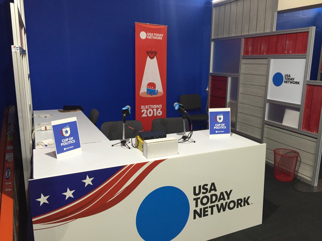 It's no conference room table covered in a quilt - but it'll do! Our @CupOfPolitics setup at #RNCinCLEpic.twitter.com/qrywiFKpxe