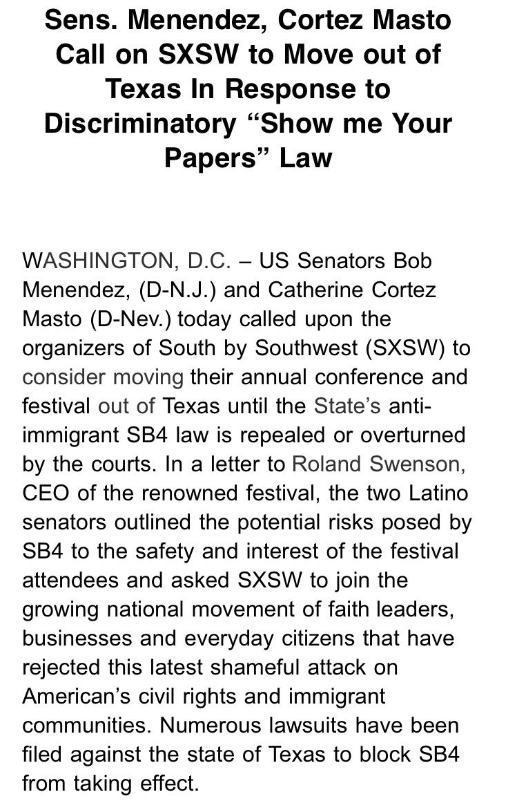 Two Democratic U.S. senators are asking organizers to move SXSW out of Texas over #SB4: pic.twitter.com/nLdwSTL9n4