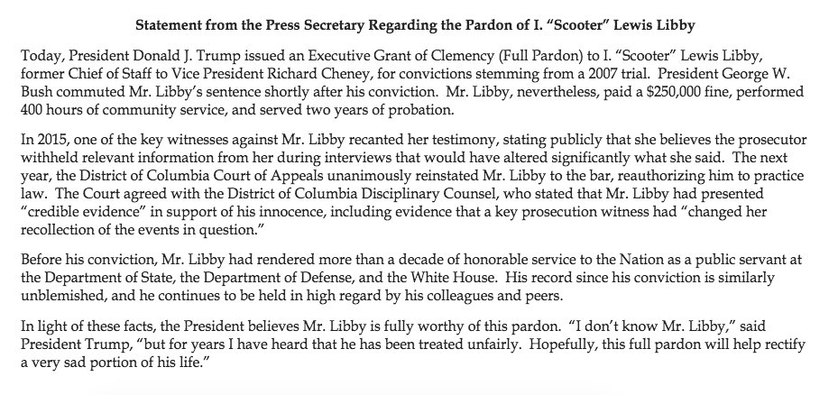 This is all about Comey. https://en.wikipedia.org/wiki/Scooter_Libby_clemency_controversy …