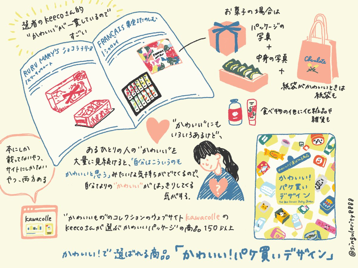 @kawacolle さんから会社に本をいただいたのでまとめ兼感想を描きました。本は元は http://kawacolle.jp というかわいいものを集めるウェブサイトで、かわいいにもいろいろあるけどkawacolle的かわいさが一貫していて、とてもすごいので、そのうち店を開いてほしいと思っています。買い物したい。pic.twitter.com/7nwR93Jk1U