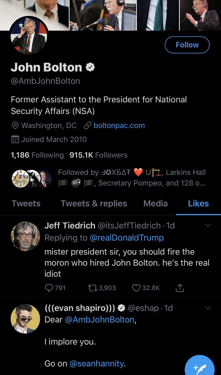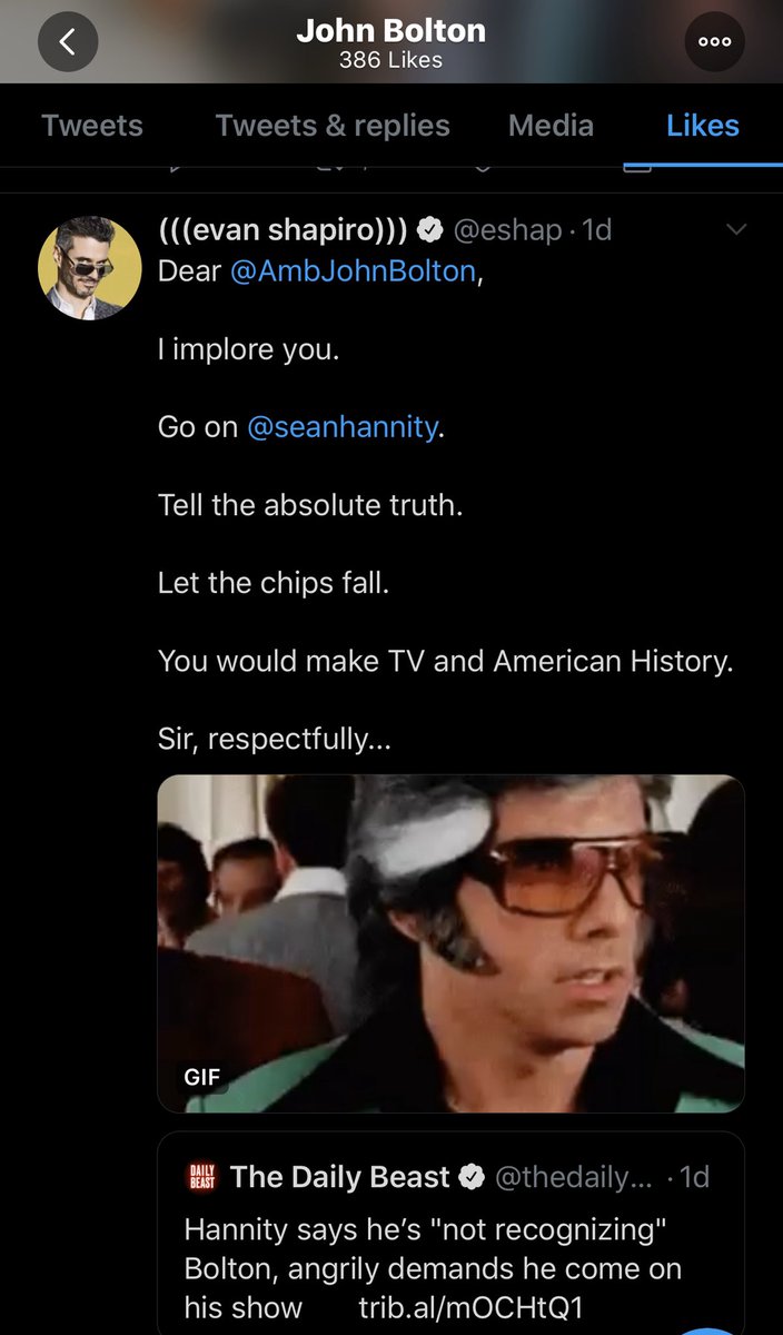 @AmbJohnBolton’s two most recent “likes” (from yesterday) One tweet mocking Trump, the other imploring Bolton to go public with his testimony