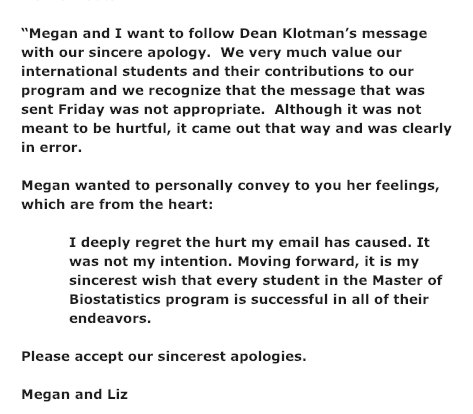 Update: Here's the letter from Mary E. Klotman, Dean of School of Medicine. "I have asked the university’s Office of Institutional Equity (OIE) to conduct a thorough review of the Master’s of Biostatistics Program..."pic.twitter.com/Z8JksiJywU