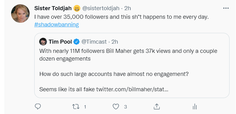Even in a tweet complaining about shadowbanning, I am ... shadowbanned. Posted this two and a half hours ago. What will you do about this practice,