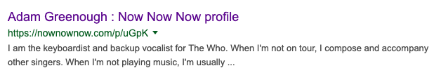 @sivers Hi Derek! Seems like the profiles on NowNowNow are picking some rather random things for their meta description. Would be great if it could be set to something specific for the user? I am (unfortunately) not a keyboardist for The Who 🤣pic.twitter.com/4eSFqoo0MT