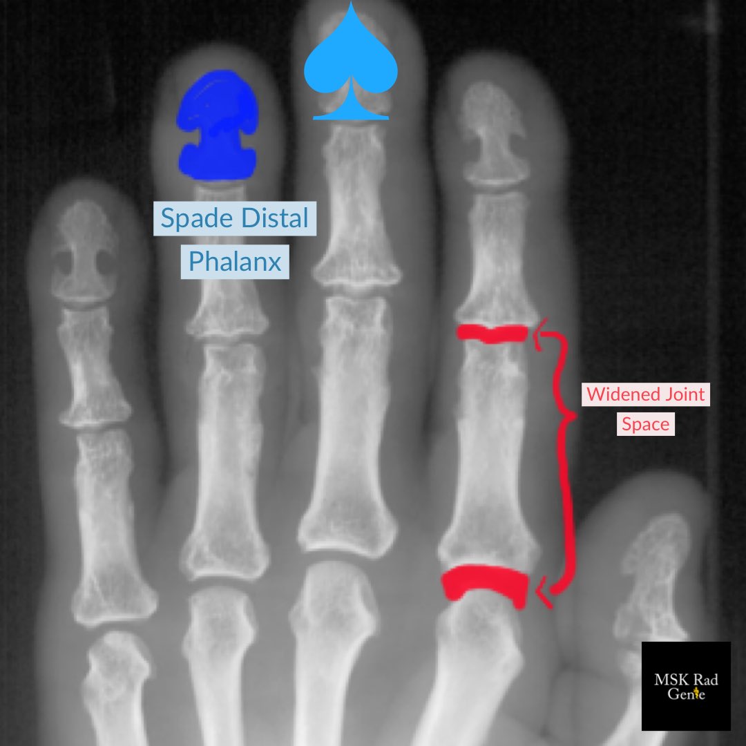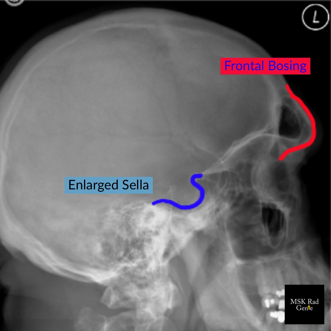 Typical MSK imaging findings in Acromegaly: 1. “Spade” hand distal phalanges 2. Frontal bossing 3. Enlarged sinuses 4. Widened joint spaces 5. Thickened heel fat pad (>2.5cm)