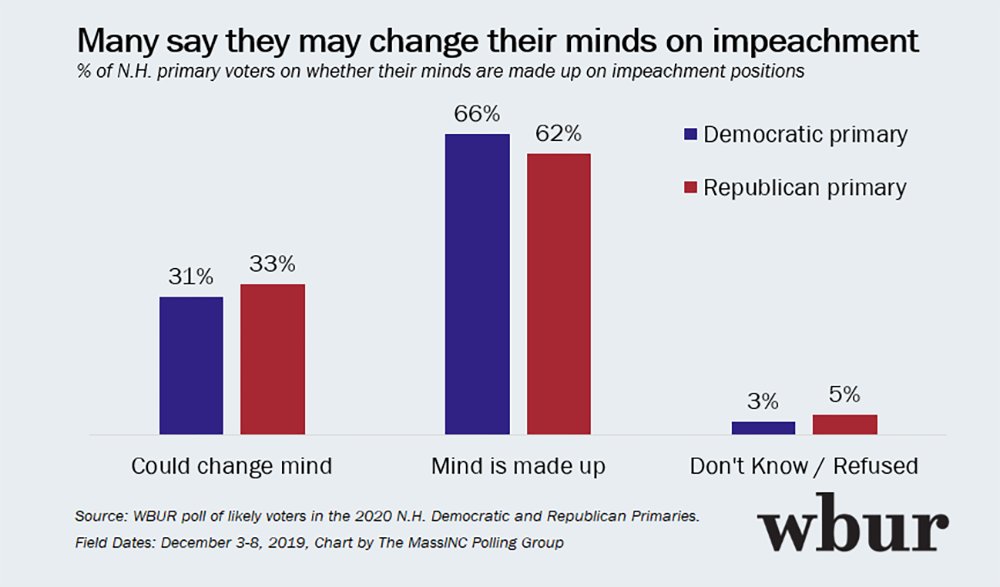 Between both primaries, about 1 in 3 in NH say they are open to changing their mind on impeachment. I'd be skeptical that this many *will*, but they say they are open to it at this point. Per @WBUR poll. https://www.wbur.org/news/2019/12/11/new-hampshire-republicans-democrats-trump-impeachment-polling …pic.twitter.com/C3eqSX64bO