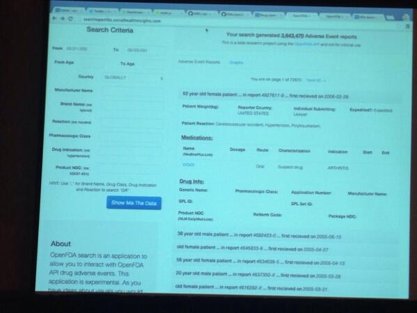 .@skram demo'ing @openfda API in action. #opendata for better health. Thanks! @skrampic.twitter.com/93XRyULBOc