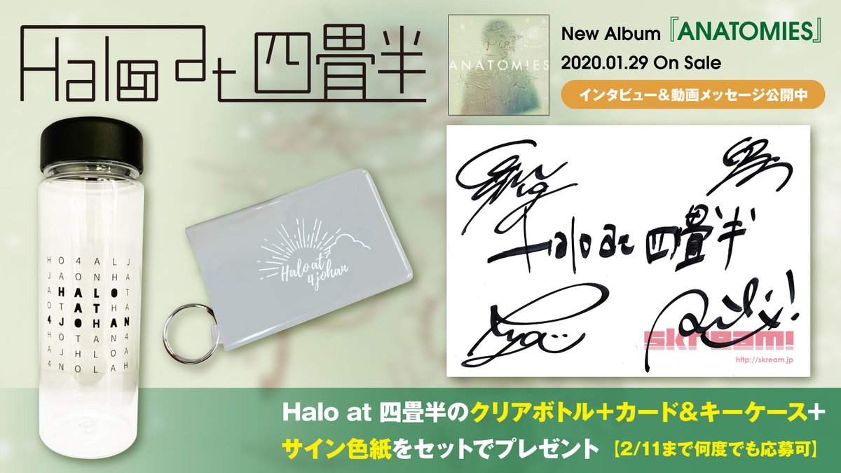 【フォロー&RTで応募】 Halo at 四畳半のクリアボトル+カード&キーケース+サイン色紙プレゼント。 迷いや葛藤をありのままに曝け出した2ndフル・アルバム『ANATOMIES』に迫るインタビュー&動画メッセージ公開中 【2/11まで何度でも応募可】