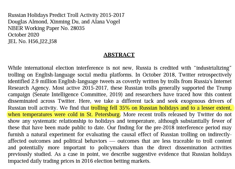 New study finds that, between 2015 and 2017, the activity of Twitter trolls dropped by 35% during Russian holidays. https://www.nber.org/papers/w28035 pic.twitter.com/IW845Hmv2P