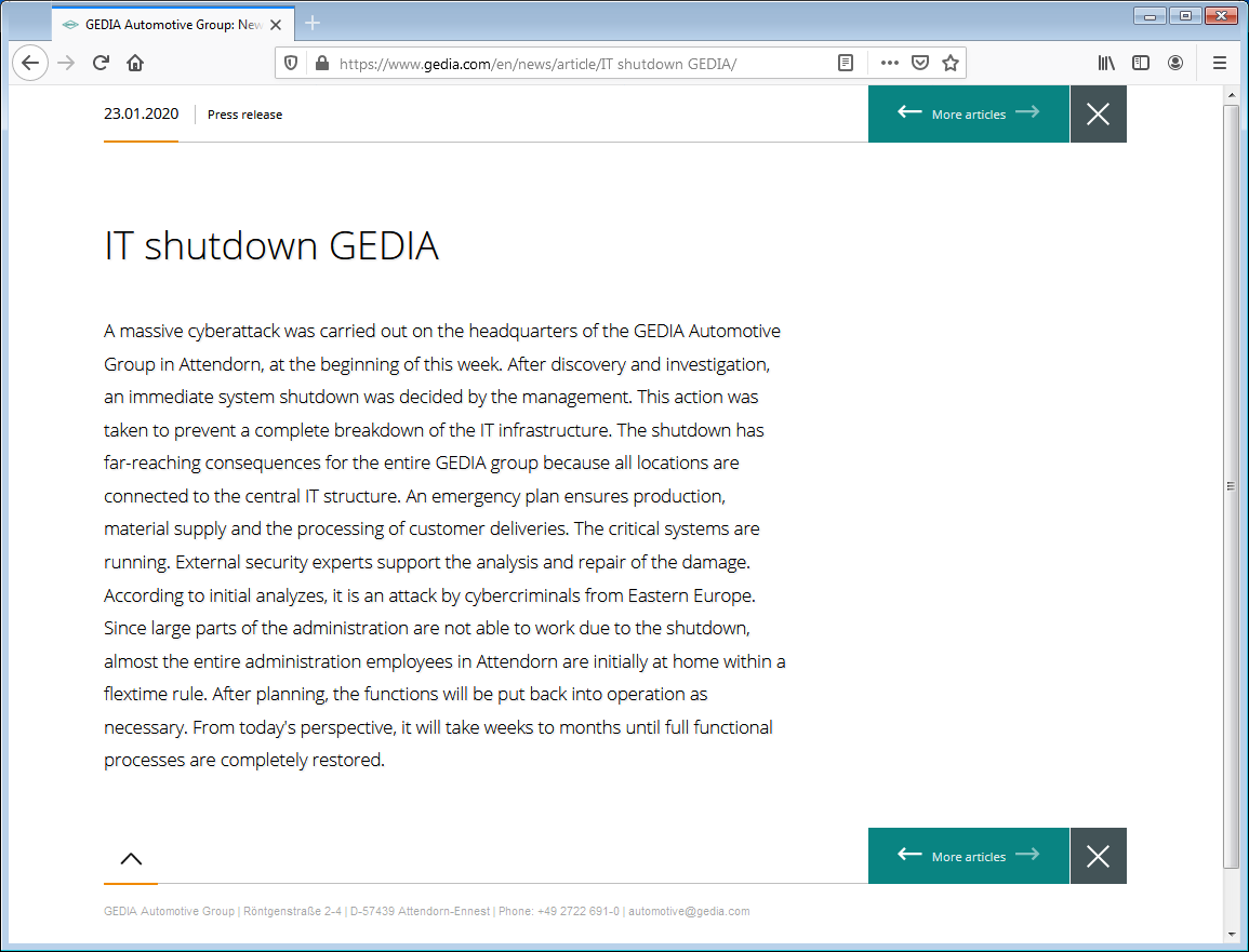 Pretty incredible statement from Gedia, since deleted, saying it will take them "weeks to months" to restore. SC Magazine reports operations also shut down in Poland, Hungary, Spain, China, India, USA and Mexico.https://twitter.com/Williamrt/status/1220695548153532416 …