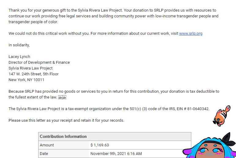 Our donation was so big we had to split it into two parts, but here it is! Thanks to the hard work of our contributors and your support, we were able to donate $5,169.63 to the Sylvia Rivera Law Project.