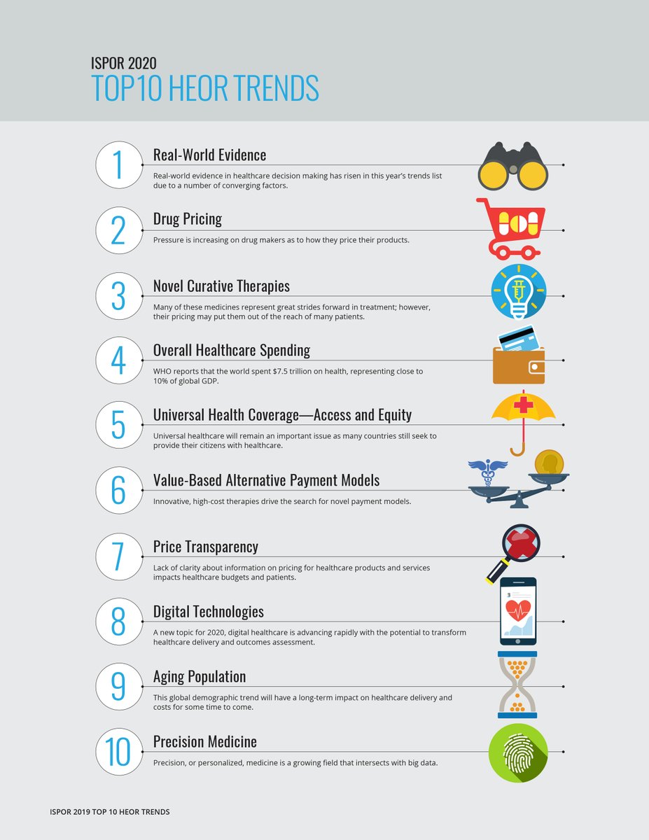 ISPOR 2020 Top 10 HEOR Trends Infographic: The identified trends for 2020 continue to dominate the headlines. Find more on the Top 10 HEOR Trends and download the full report at http://www.ispor.org/top10trends .