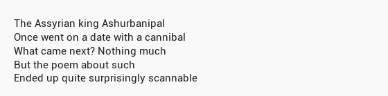 The Assyrian king Ashurbanipal Is somehow not the first line of ten thousand limericks. Come on, Google, someone must have written those.