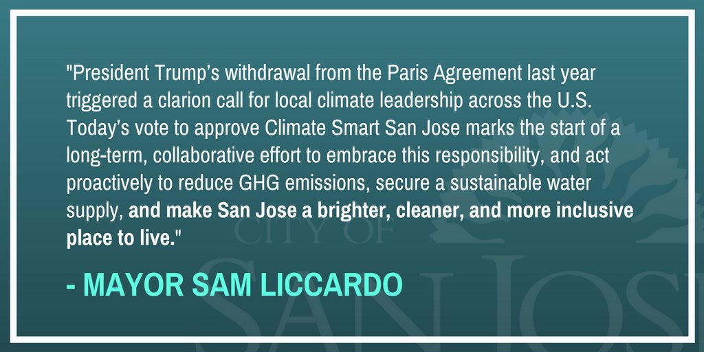 #ClimateSmartSanJose, making our city among the first in America to plot a path to Paris, and meet the ambitious sustainability targets outlined by the#ParisAgreement.pic.twitter.com/8ecL77yWW2