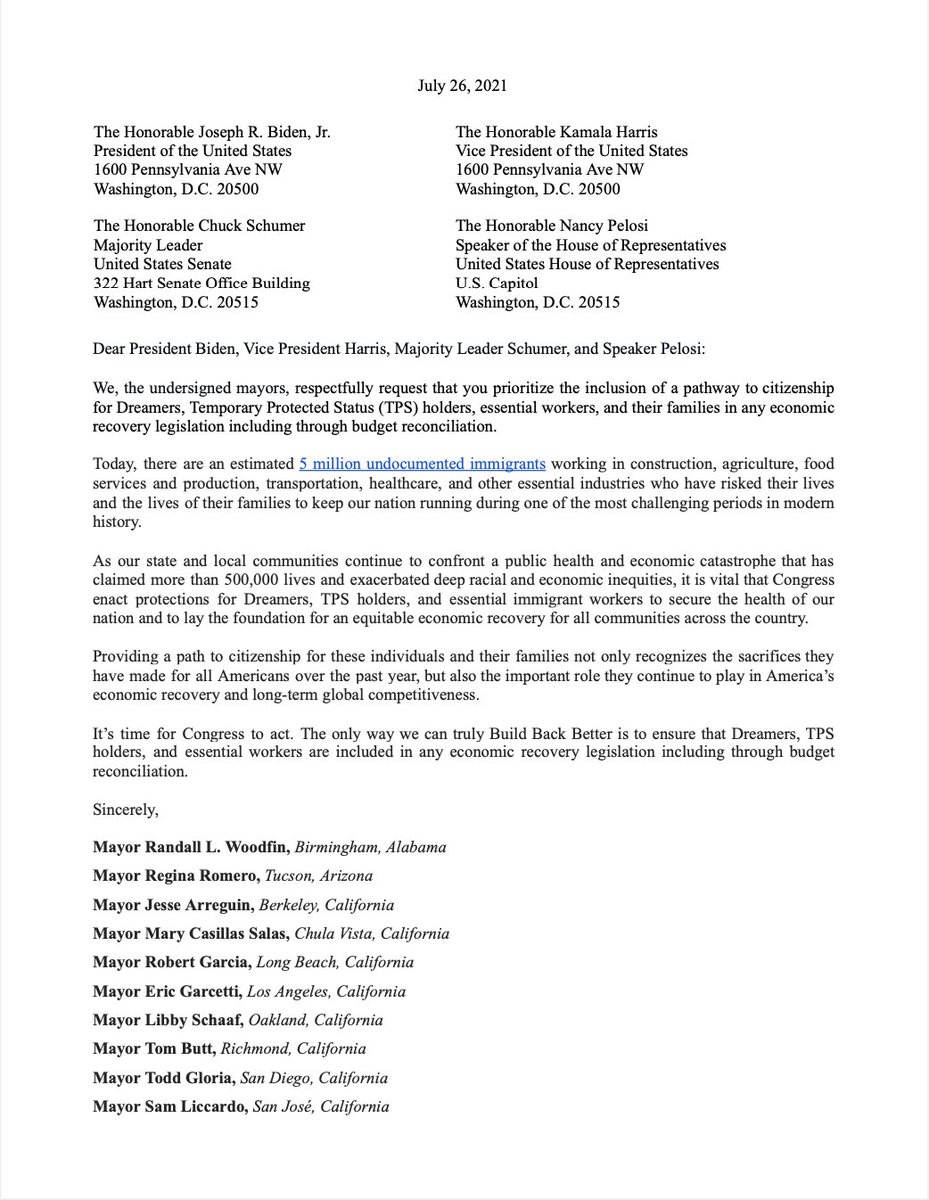 I joined Mayors across the country, urging Congress to ensure a pathway to citizenship in the reconciliation package for Dreamers, essential immigrant workers, & TPS holders. We must protect San Joséans from a failed immigration system & fear of deportation.