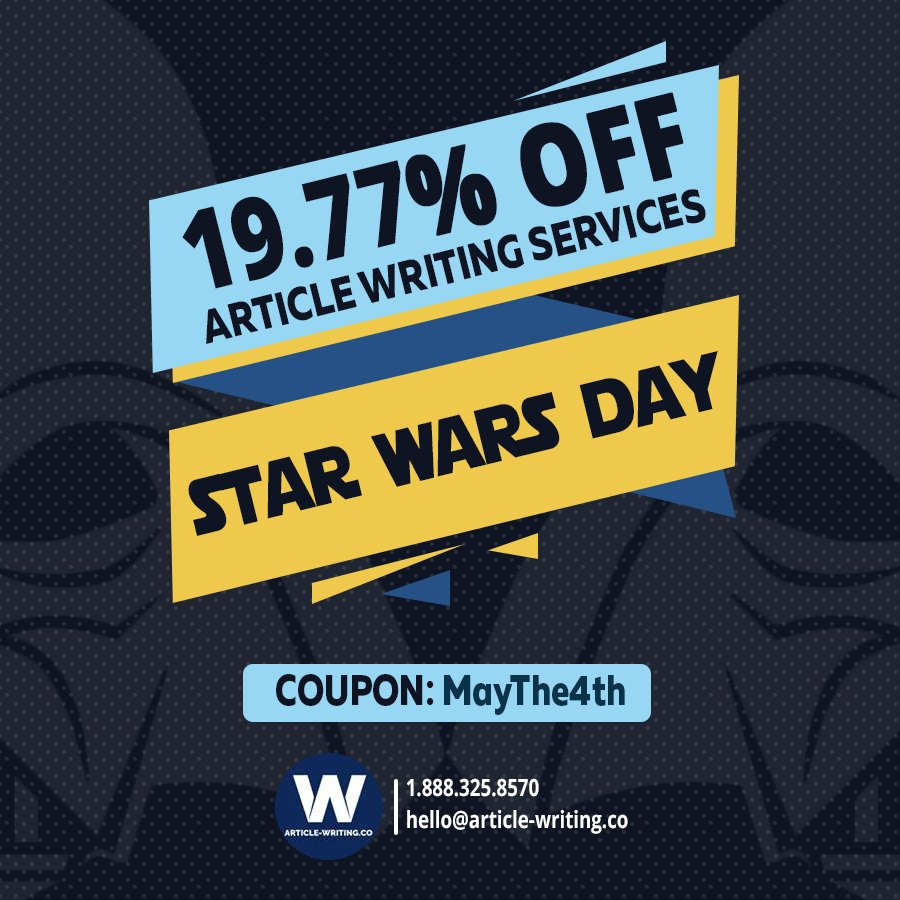 We've extended our Star Wars Day Promotion. 19.77% off your Article Writing Order. Visit our website here: https://www.article-writing.co/product/article-writing/ … At checkout make sure to add the coupon: MayThe4th A member of the team will be in touch ASAP!pic.twitter.com/DGqtRmzL8w