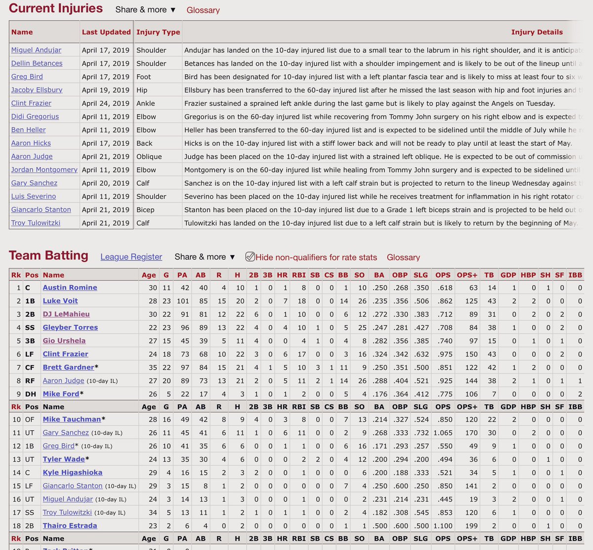 And their 2019 Current Injuries list is wider their their entire Team Batting list. Wild stuff