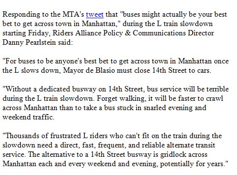 @TransAlt started the#PeopleWay campaign for a car-free 14th St to help mitigate the, now,#LTrainSlowdown. Big win for bus-riding NYers and L Train riders! Lemons to lemonade. Also#bikenyc win.https://twitter.com/amNewYork/status/1120876312518852609 …