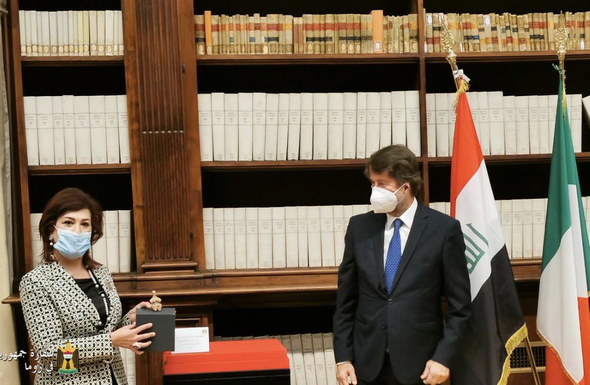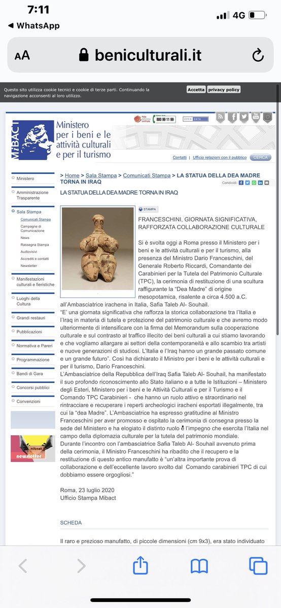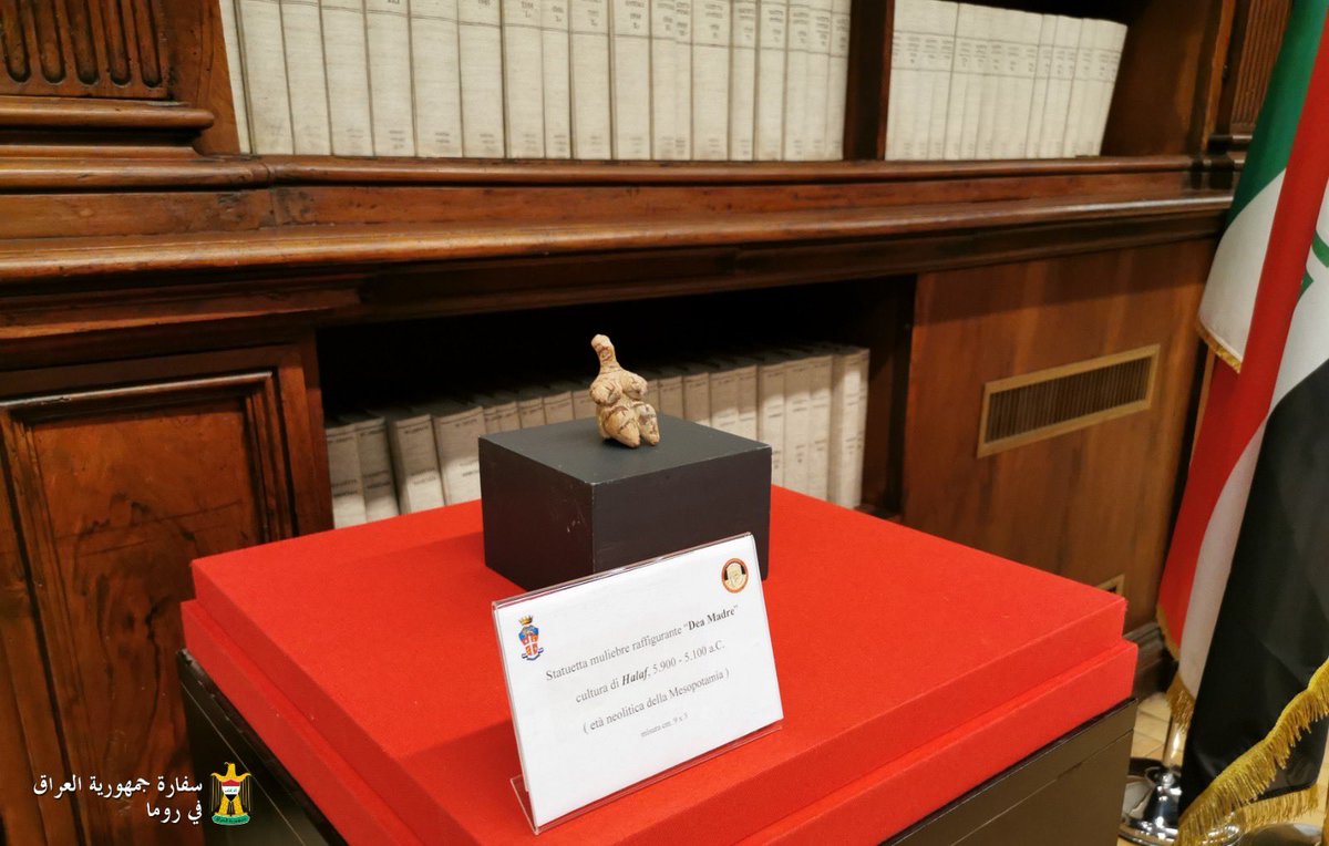 #العراق لتمثال"الالهة الأم" الذي يرمز لخصوبة وأمومة المراة والذي يعود ل 5000 سنة ق.م وذلك بمراسيم تسليم رسمية برعاية وزير الثقافة الايطالي وبحضور قائد وحدة حماية التراث لقوات الدرك الكاريبنيري وممثل وزارة الخارجية الايطالية وكادر متقدم من السفارة#