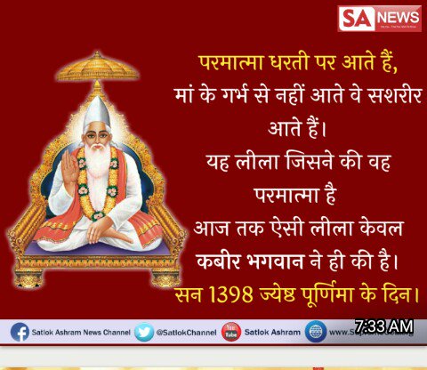 #कबीरप्रभुकीलीलाएँ वेदों में प्रमाण है, #पूर्णब्रह्म_कबीर साहेब है, पवित्र पुस्तक कुरान सरीफ 25 के आयात नम्बर 52 से 59 में कहा है कि सबसे बड़ा भगवान कबीर है, जिसकी जानकारी किसी तत्व दर्शी संत से पूछो, जानने के लिए:- साधना tv पर रात्रि 7:30 सेpic.twitter.com/nFQcTFCmcR
