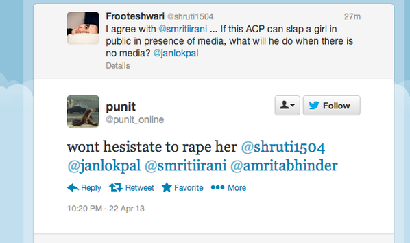 @smritiirani BLOCKING & REPORTING?@punit_online WAS TALKING ABOUT THE COP. Probability of SAME COP raping her in absence of media is highThanks. Twitter will use this to make your timeline better. UndoUndo