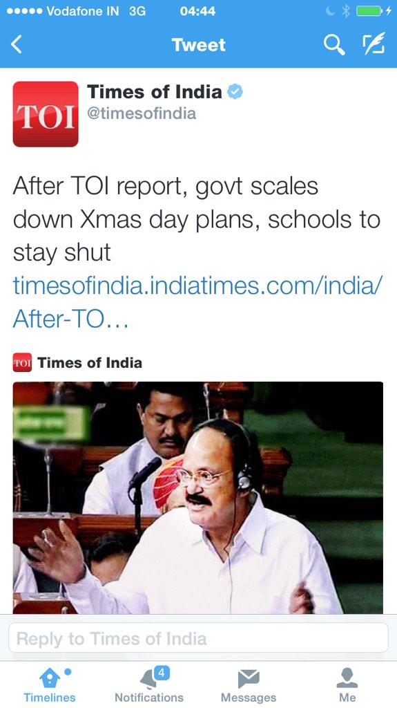 @smritiirani see how shameless@timesofindia is that it is still claiming victory http://timesofindia.indiatimes.com/india/After-TOI-report-govt-scales-down-Xmas-day-plans-schools-to-stay-shut/articleshow/45529102.cms?utm_source=twitter.com&utm_medium=referral&utm_campaign=TOIIndiaNews …pic.twitter.com/5CGbB7Gogy