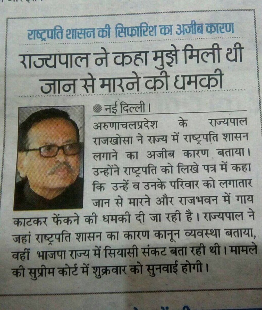 @smritiirani @JitinPrasada अरुणाचल राज्यपाल परिवार को धमकी तो राष्ट्रपति शासन की सिफारिश बहुत खूबpic.twitter.com/jLcKRgpgOK
