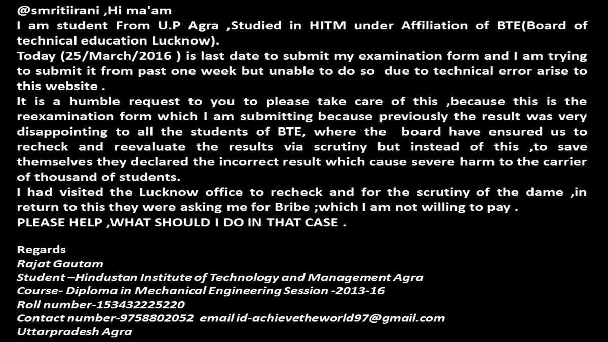 @smritiirani none replies queries on mail. Should everyone come to Delhi to know about it? If yes then tell me where should I come ?Thanks. Twitter will use this to make your timeline better. UndoUndo