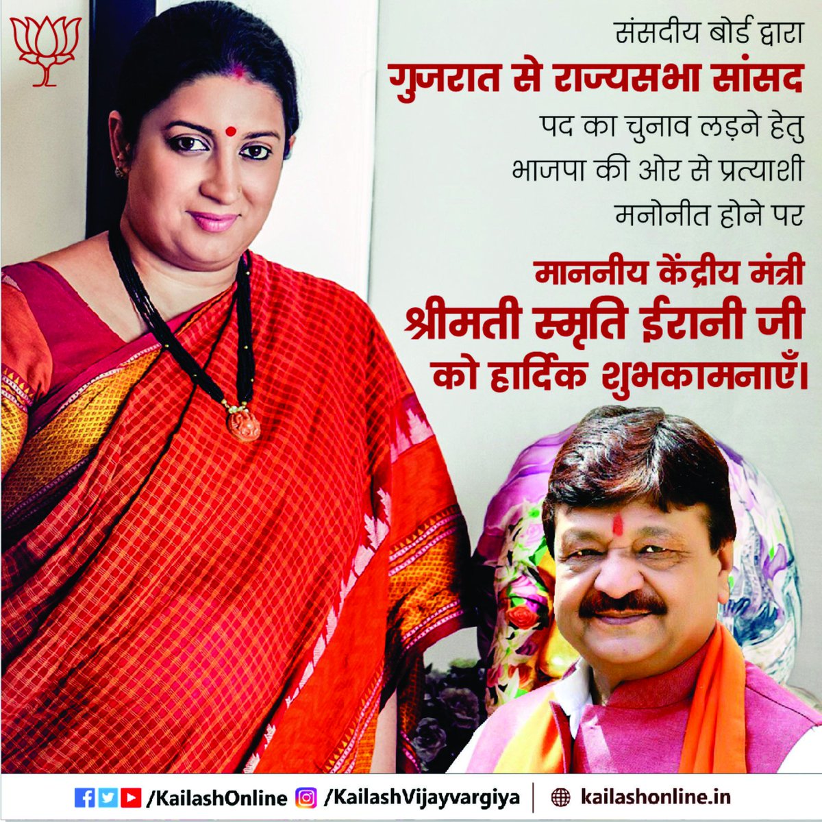 माननीय केंद्रीय टेक्सटाइल मंत्री व I&B मंत्री श्रीमती @smritiirani जी को #Gujarat से #RajyaSabha के चुनाव हेतु चयनित होने पर हार्दिक बधाई।pic.twitter.com/N7iYeaEAYh