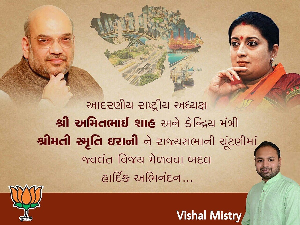 આદરણીય રાષ્ટ્રીય અધ્યક્ષ શ્રી અમીતભાઈ શાહ અને કેન્દ્રીય મંત્રી શ્રીમતી સ્મ્રૃિત ઈરાની ને રાજ્યસભાની ચૂંટણી જ્વલંત વિજય મેળવવા બદલ અભિનંદન..