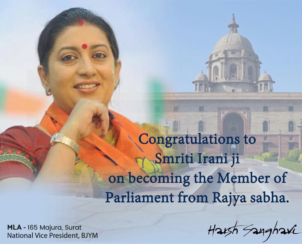 Congrats for becoming the member of parliament from Rajya Sabha.@SmrityIrani
