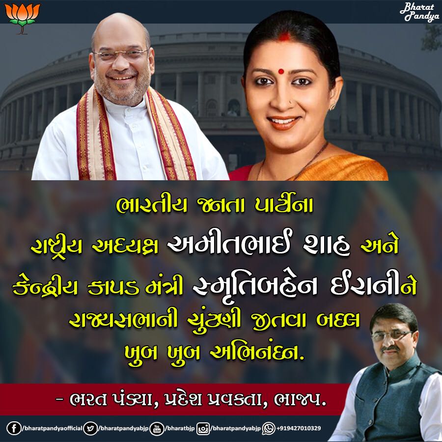 રાષ્ટ્રીય અધ્યક્ષ @AmitShah અને કેન્દ્રીય કાપડ મંત્રી @smritiirani ને રાજ્યસભાની ચુંટણી જીતવા બદલ ખુબ ખુબ અભિનંદન.pic.twitter.com/ghXEwaNwq9