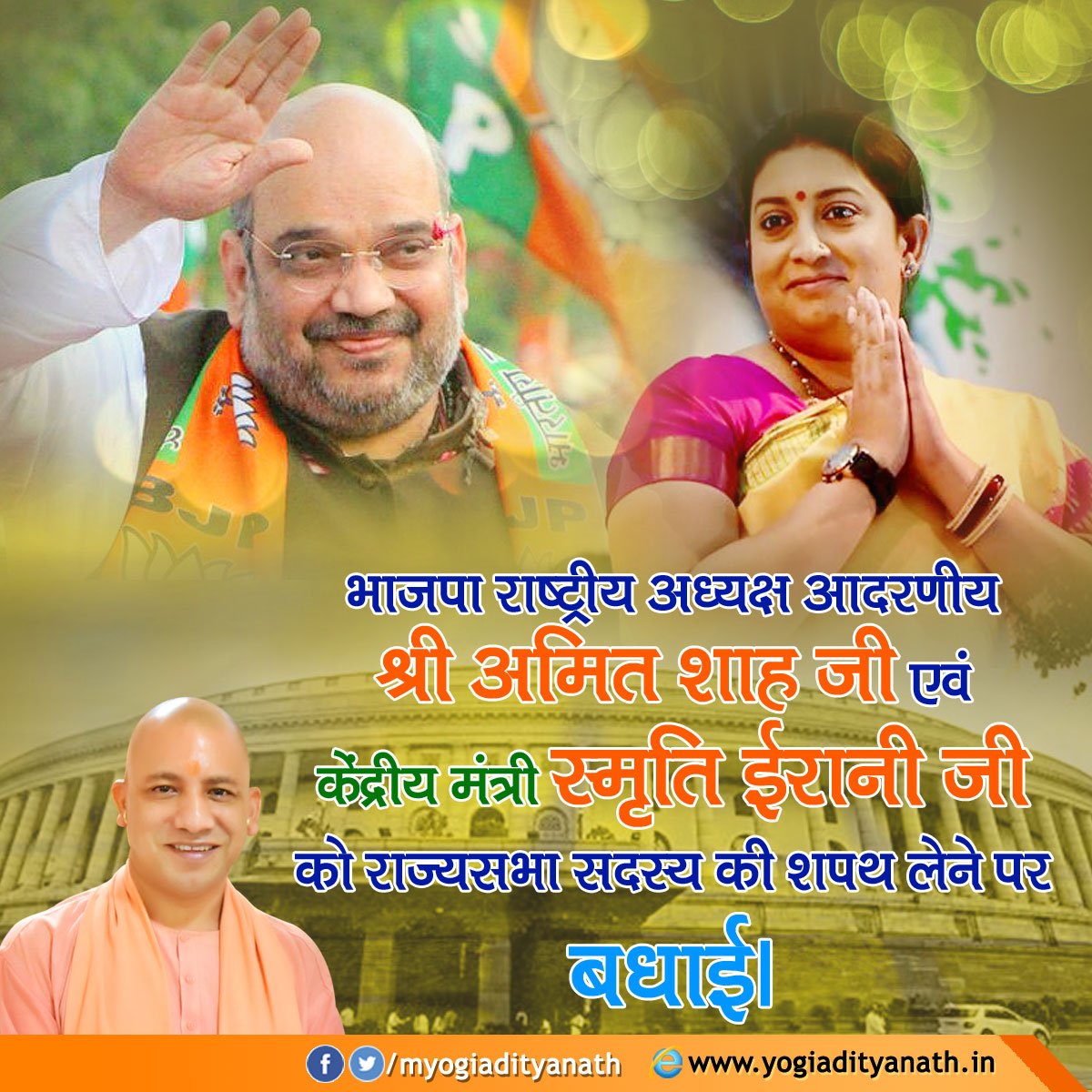 भाजपा राष्ट्रीय अध्यक्ष आदरणीय श्री @AmitShah जी एवं केंद्रीय मंत्री @smritiirani जी को राज्यसभा सदस्य की शपथ लेने पर बधाई।pic.twitter.com/MnkmPSiY0U
