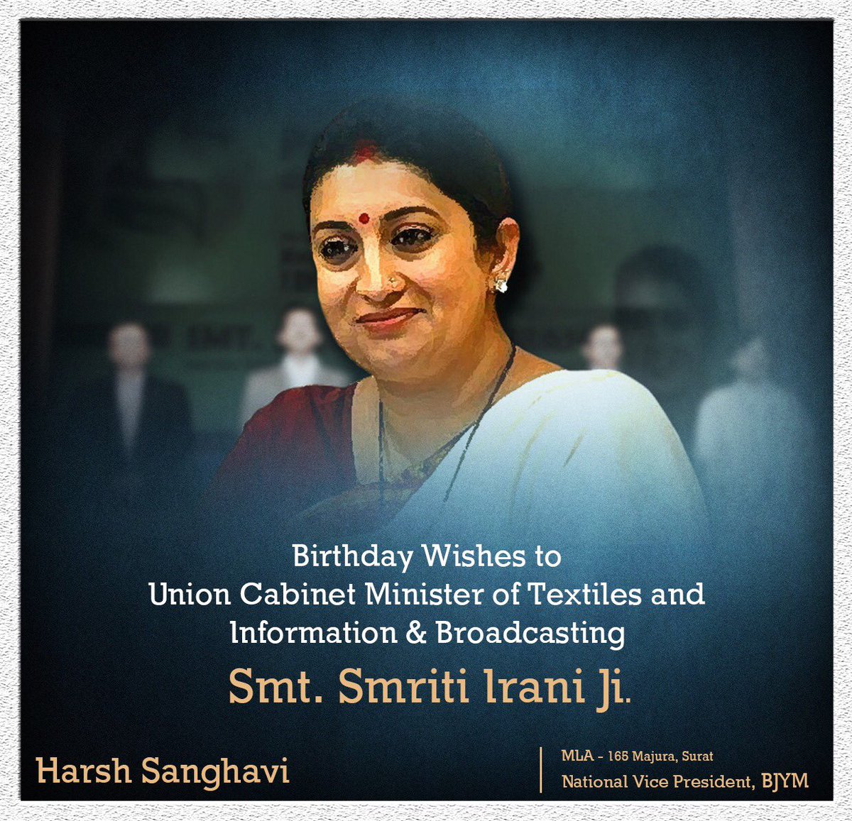 Warm Birthday wishes to Union Minister for textile and information broadcasting Smt @smritiirani Ji.