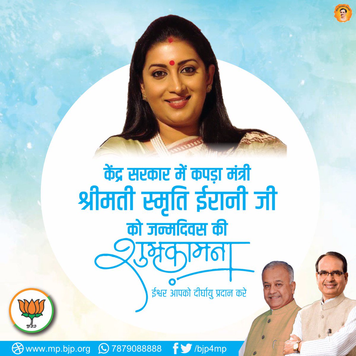 केंद्र सरकार में सूचना व प्रसारण और कपड़ा मंत्री श्रीमती @smritiirani जी को जन्मदिवस की हार्दिक शुभकामनाएं।pic.twitter.com/afStSM9KOx