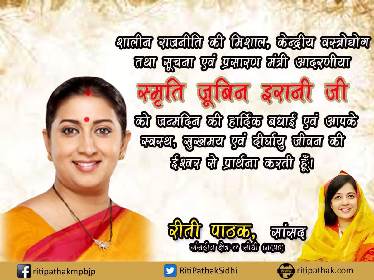 केन्द्रीय मंत्री आदर्णीया @smritiirani जी को जन्मदिवस की हार्दिक शुभकामनाएँ।।pic.twitter.com/F33reYI9Sw