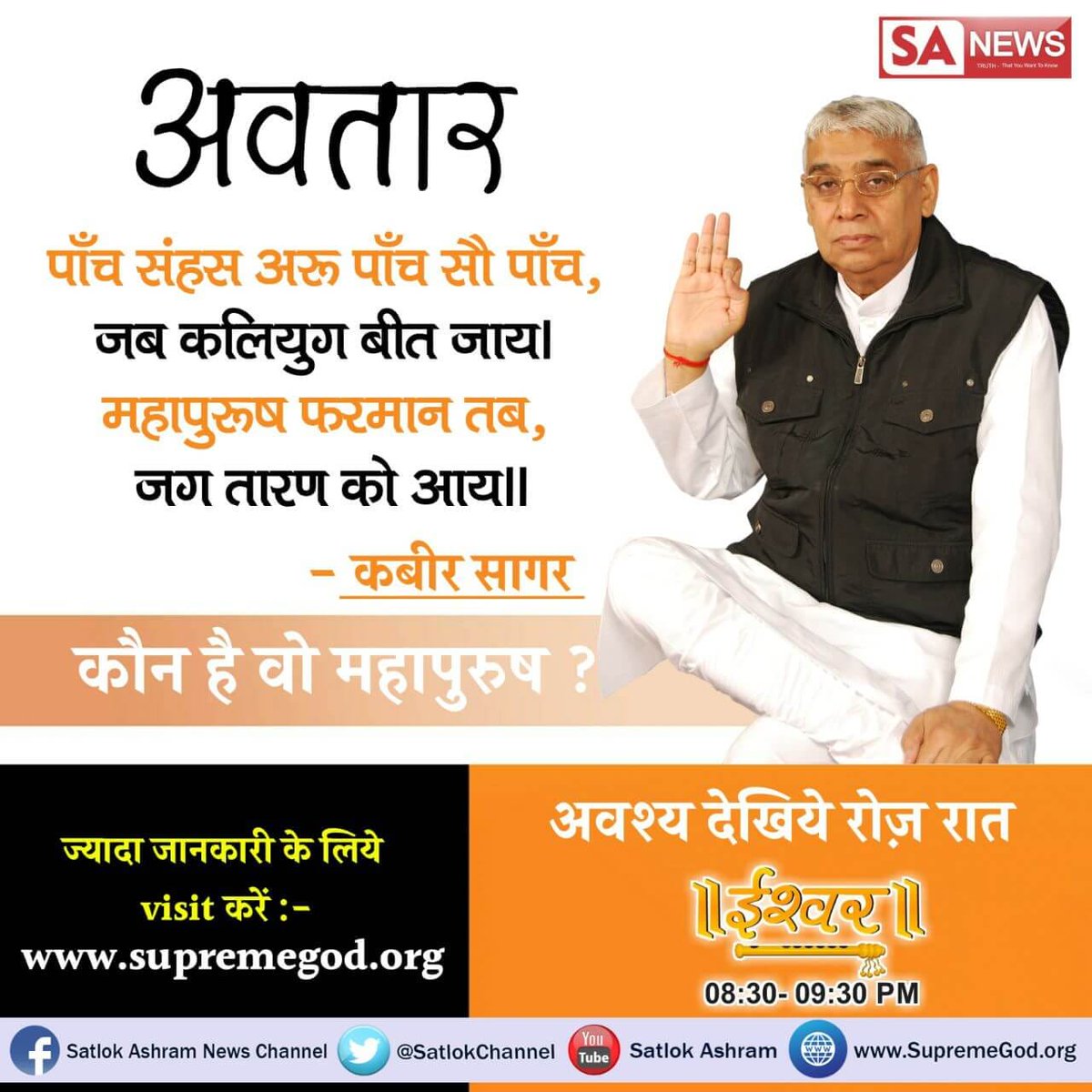 #PredictionsAbout_SaintRampalJi वह दयालु परमात्मा कौन है? जिसने सृस्टि रची जो पापकर्मो का नाश करता है मृत्यु से बचा सकता है जिसकी भक्ति से दुर्घटना बीमारी मौत का डर समाप्त हो जाता है देखिये 100%प्रमाणों के साथ साधना टीवी 7.30pmpic.twitter.com/8CeB976GqI