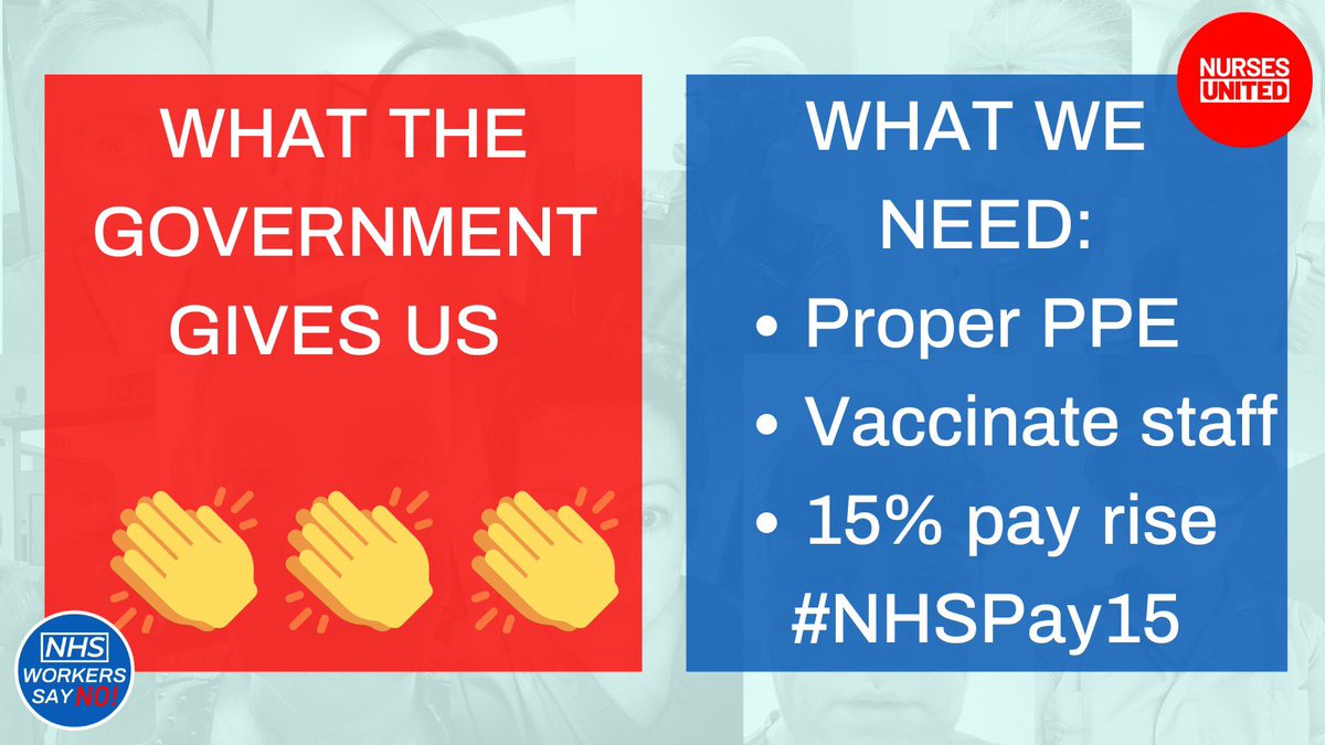 Now is not the time for applause. Frontline workers have been let down repeatedly by this incompetent Government. We demand: Proper PPE Vaccinations for frontline Staff 15% Restorative pay increase