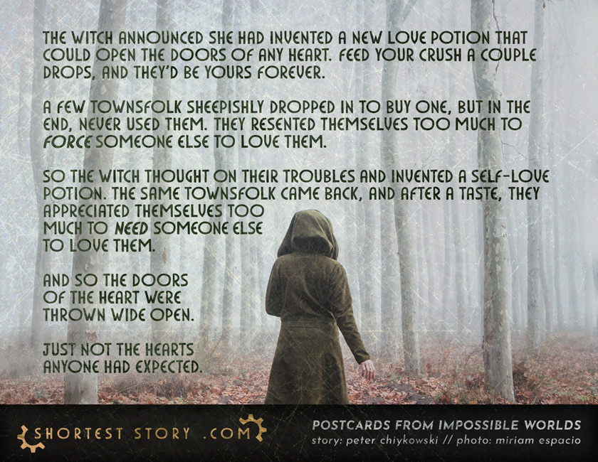 SELF-LOVE POTION // a postcard story about how love potions are VERY PROBLEMATIC From my weekly postcard fiction project