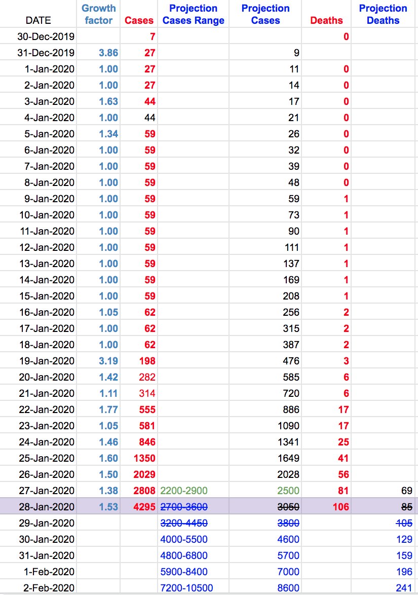 #coronavirus counts for Jan 28 (CN TZ): The growth rate is x1.53 and is over x1.23 but not unexpected. Small sample but it has been x1 - x1.77 Based on this, should expect 4900-5700 cases and 120-130 deaths tomorrow.pic.twitter.com/fhIJ16XZm7
