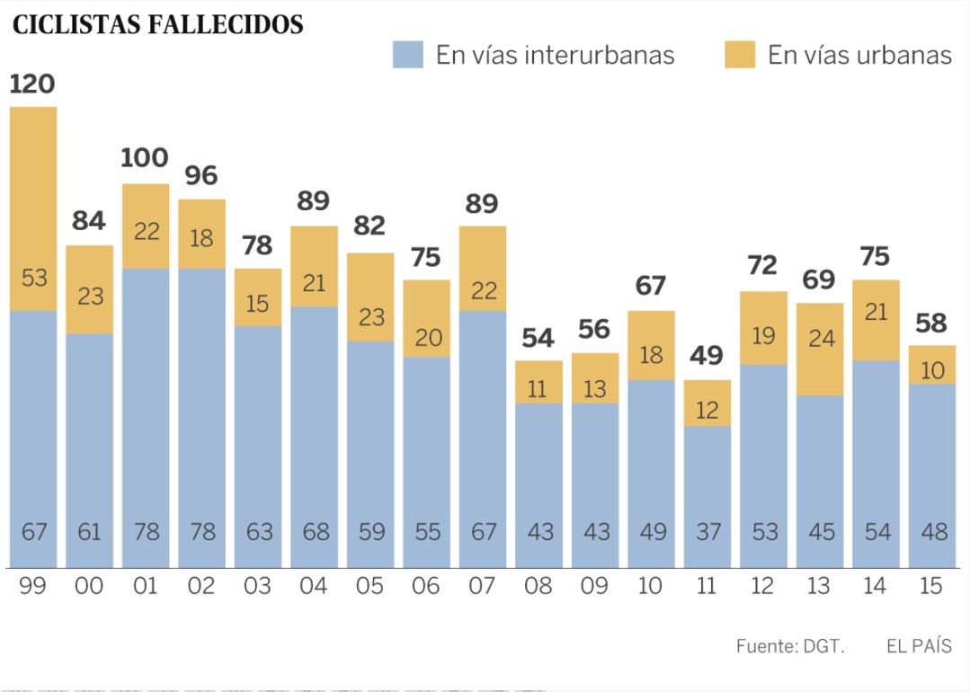 Ciclistas fallecidos x atropello en España,en vía urbana e interurbana,1999-2015. Tan apenas ninguno en carril bici o infra ciclista segura.pic.twitter.com/D0RVK97RLk