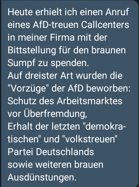 #AfD derzeit über ein#Callcenter nach Spenden und ruft dafür Unternehmen und Privatpersonen an. Die Quelle arbeitet in#NRW und hat heute dienstlich einen solchen Anruf erhalten. /TN#FCKNZS#fckAfDpic.twitter.com/icKVky9XyG