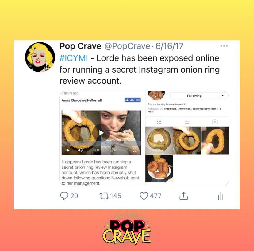.@Lorde reactivates her Instagram onion ring review page after recently revealing she has a name for third studio album: “Don’t call it a crumb back...” pic.twitter.com/4HV0Je04lm