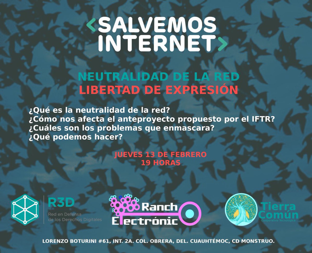 #NeutralidadenlaRed y#LibertaddeExpresión a partir de las 19:00 Invitan nuestrxs compas de@R3Dmx y@tierra_comun <Salvemos Internet>