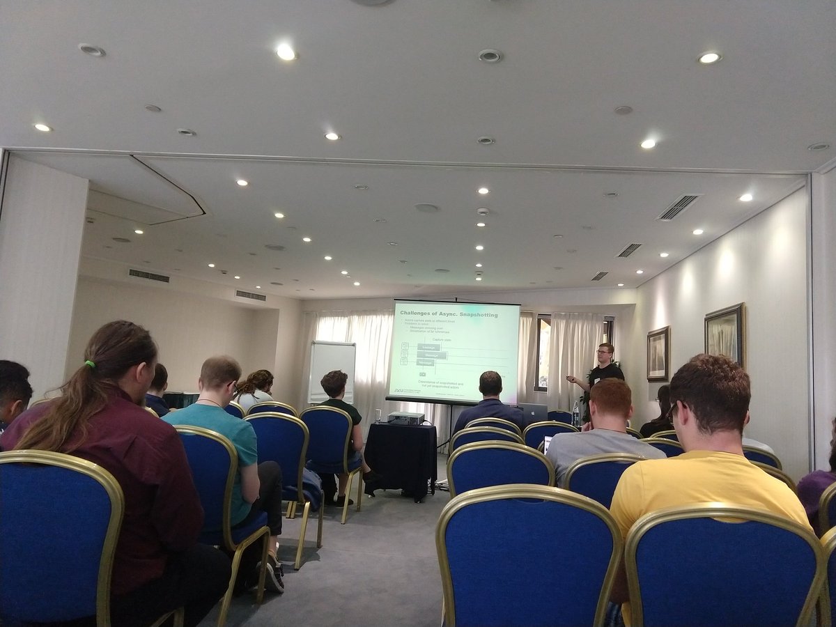 @d_aumayr presenting our work at@MPLR_Conf. Asynchronous Snapshots of Actor Systems for Latency-Sensitive Applications. With@elisagboix https://stefan-marr.de/downloads/mplr19-aumayr-et-al-asynchronous-snapshots-of-actor-systems-for-latency-sensitive-applications.pdf …pic.twitter.com/bN6LSOLOOu