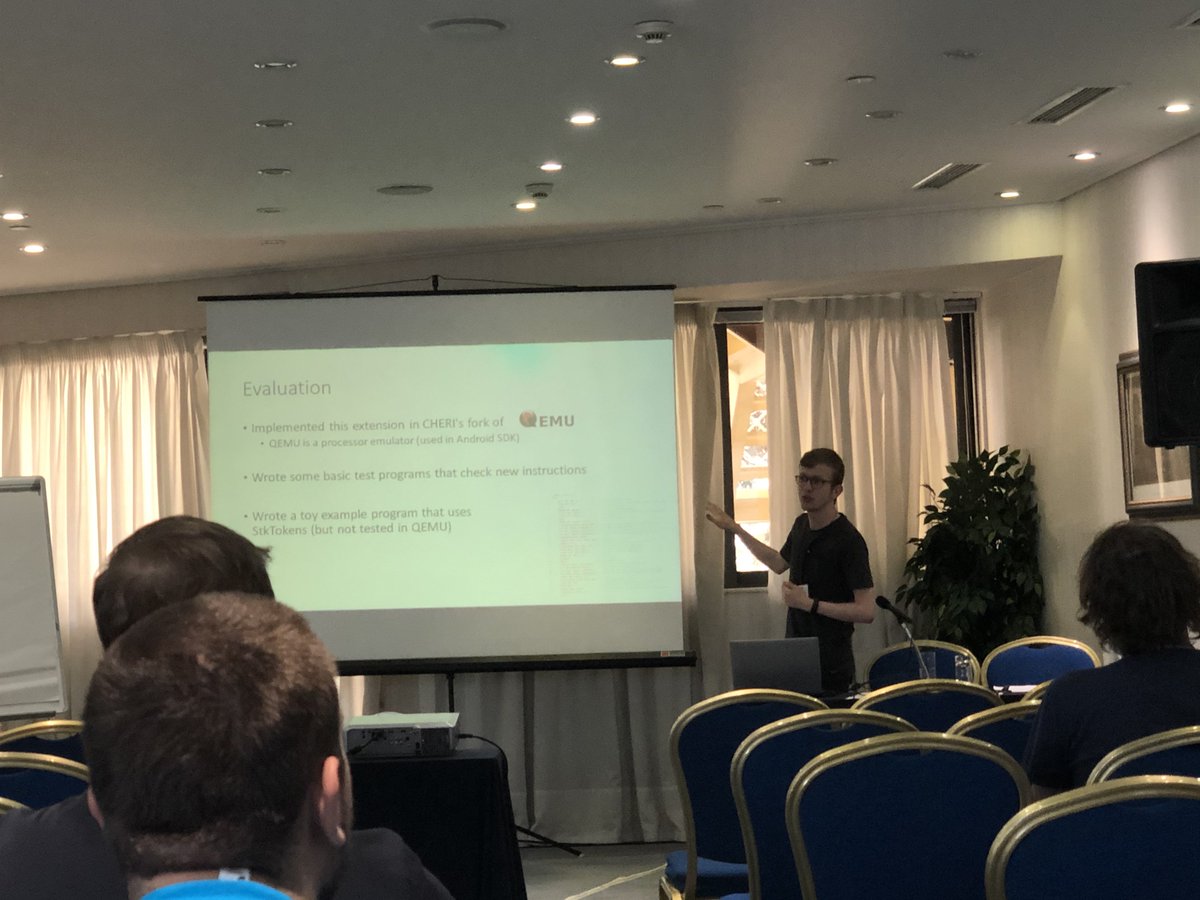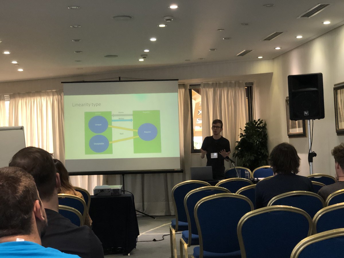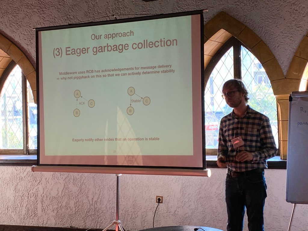@jimbauwens presenting our work on memory efficient CRDTs in dynamic environments.#splash19 http://2019.splashcon.org/details/vmil-2 …pic.twitter.com/lHCIuKHTSp