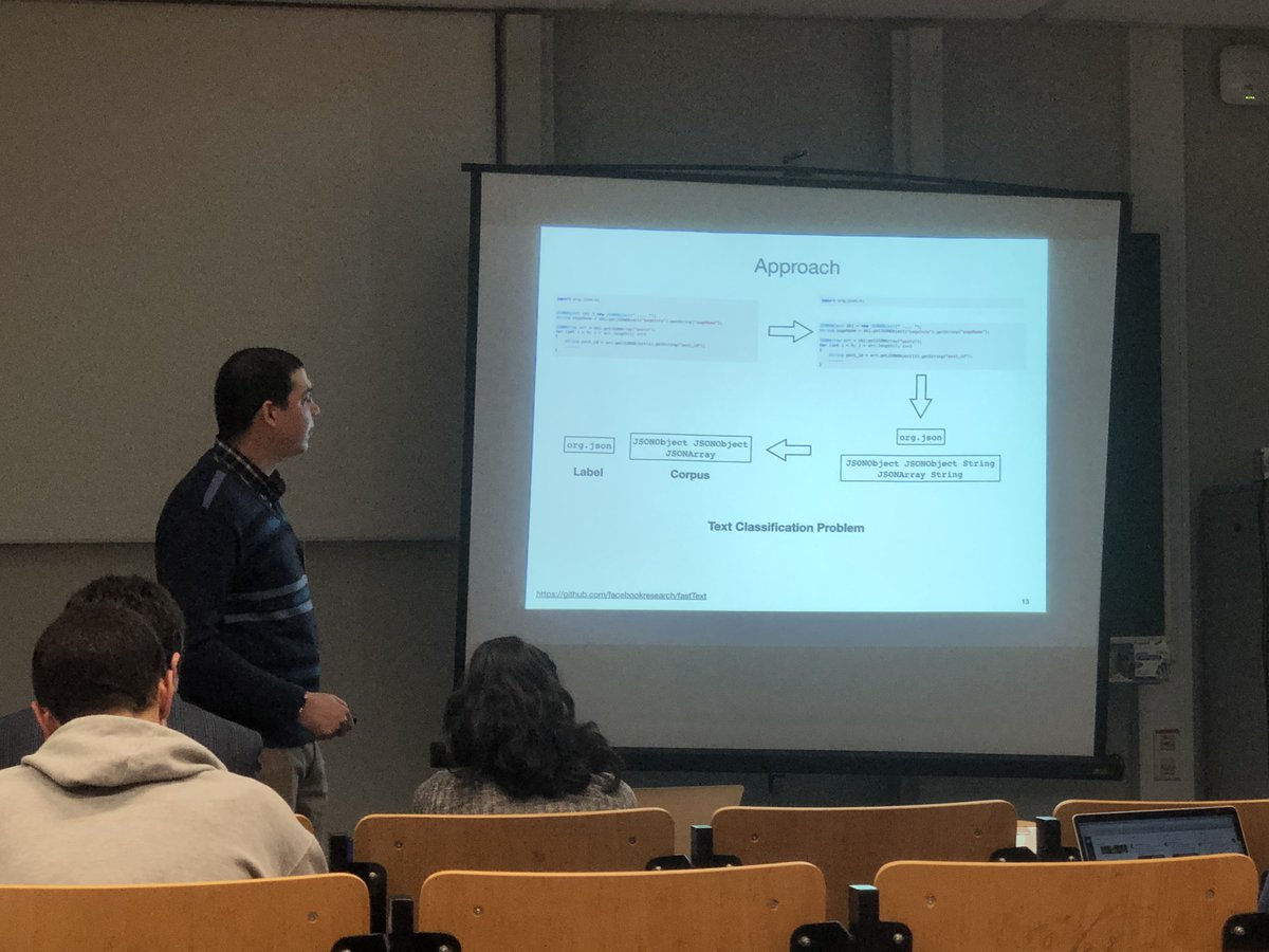 @cvelazquezr@softlab_brussel@DINFVUB demonstrating to the@Benevol2019 audience how machine learning can resolve simple names in code snippets on StackOverflow.pic.twitter.com/EKEURy6Emo